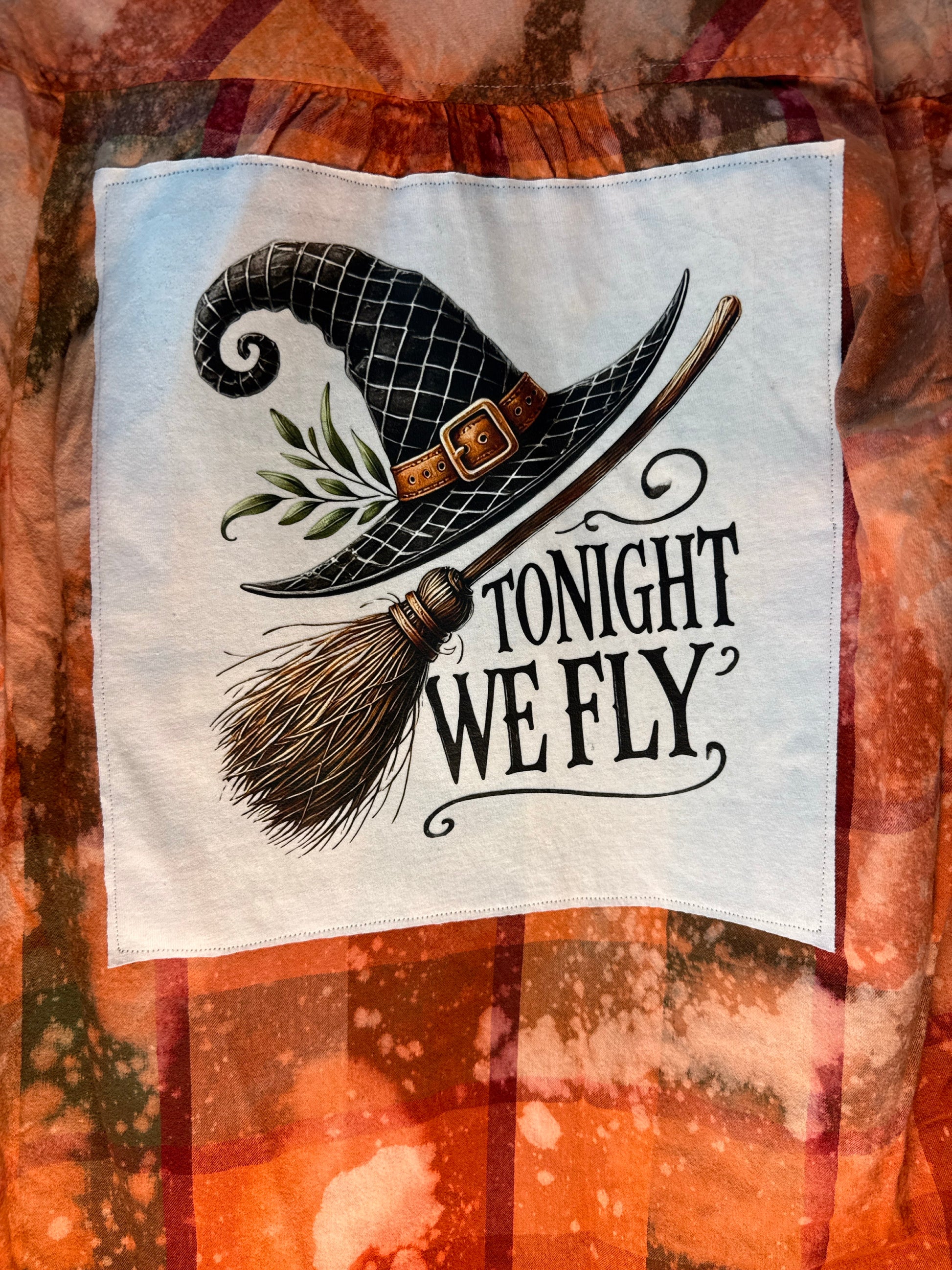 Grab your hat, grab your broom — the coven’s got plans. This fiery flannel has been hand-dyed and bleach-distressed into a pumpkin-spiced sunset of orange and ember. On the back, a bold patch declares “Tonight We Fly” with a classic witch hat and broom design. Equal parts cozy and chaotic, it’s the perfect layer for fall nights, broom rides, and moonlit mischief.