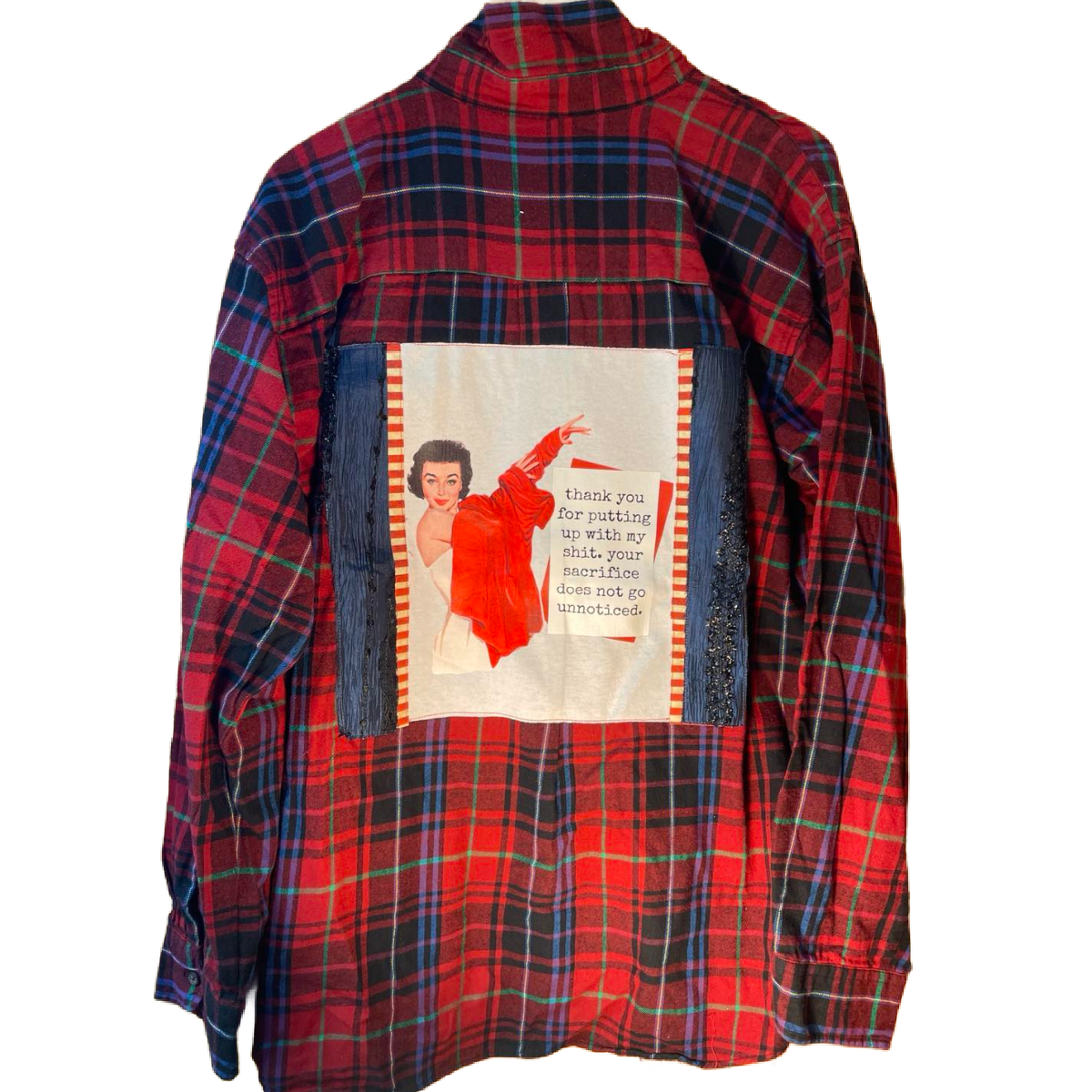This one-of-a-kind upcycled flannel is stitched for the saints who’ve endured your nonsense, drama, bad texting habits, and questionable life choices — and somehow still show up.