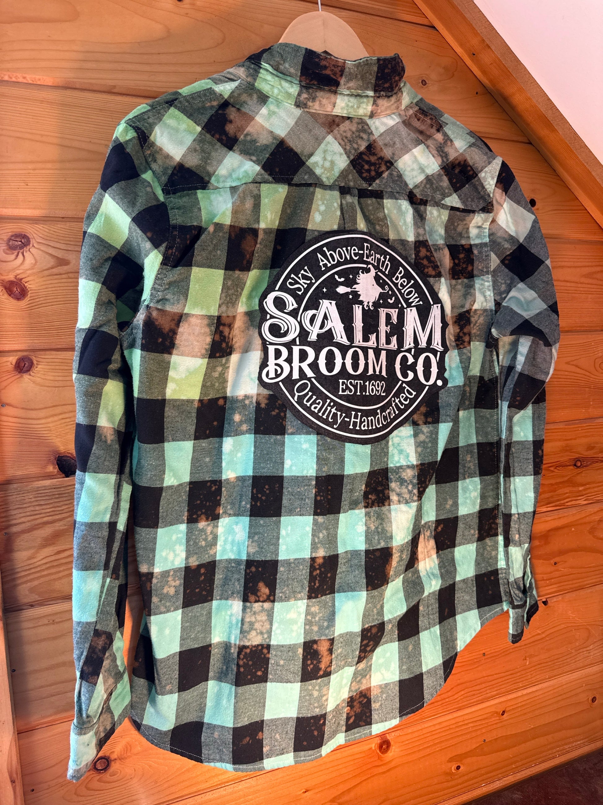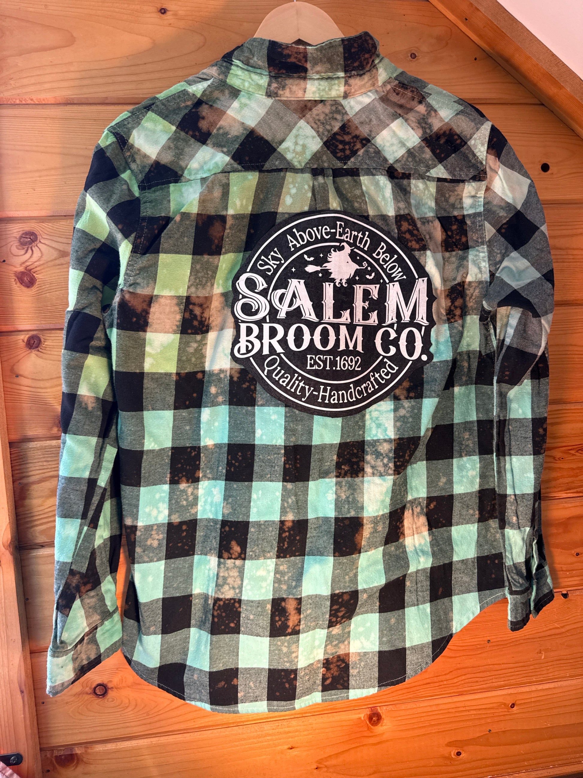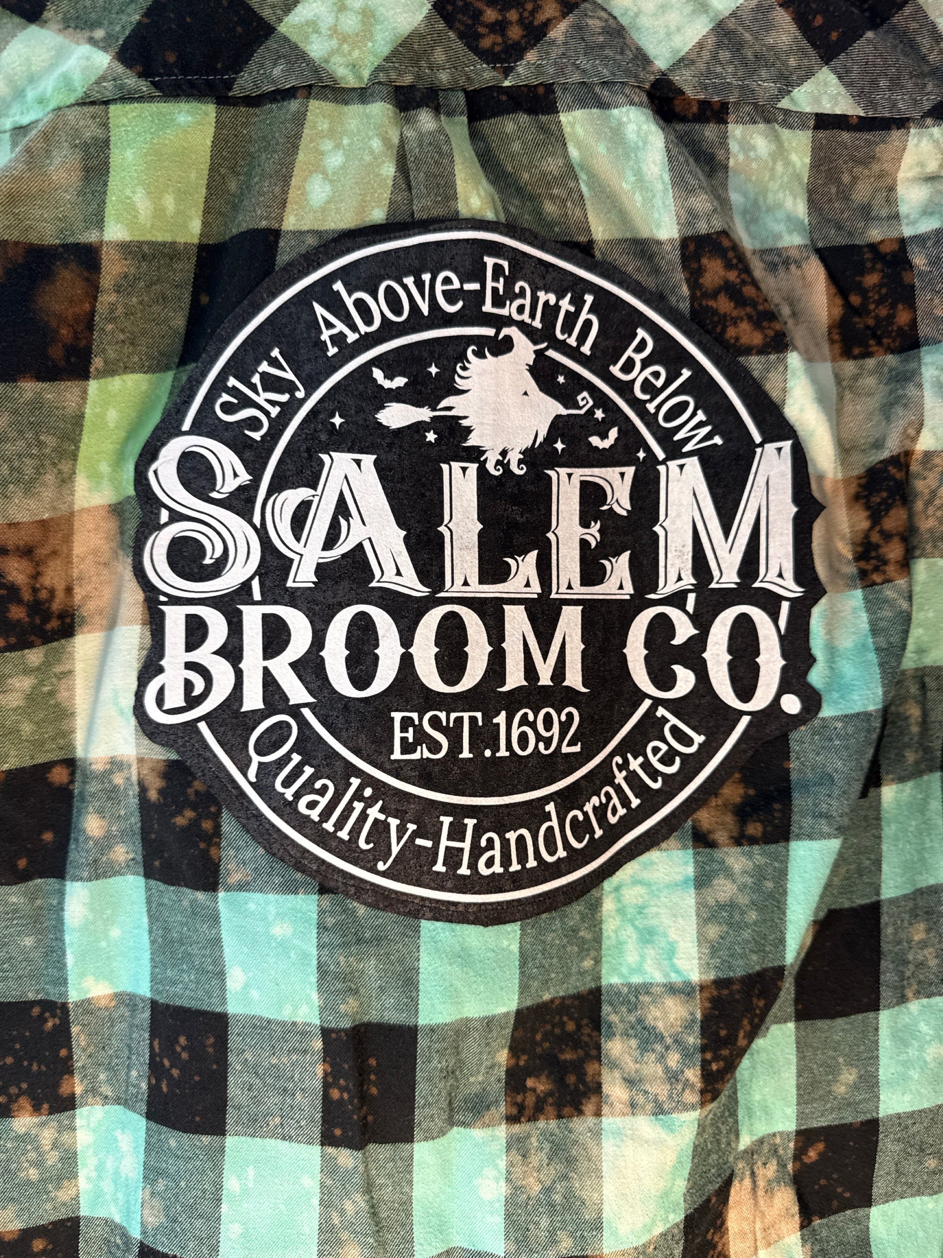 For the witches who prefer their plaid with a little spellwork. This hand-dyed, bleach-distressed flannel features a bold Salem Broom Co. back patch — a nod to 1692 with “Sky Above, Earth Below” magic stitched right in. The green + black buffalo check base is weathered and witchy, making it perfect for bonfires, broom rides, or just bossing around your coven in style.